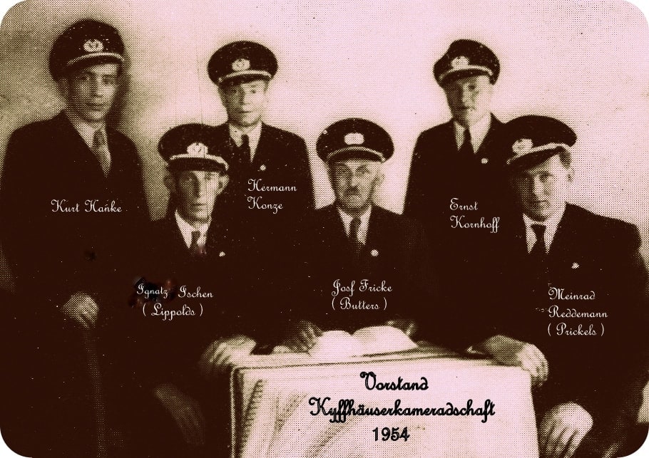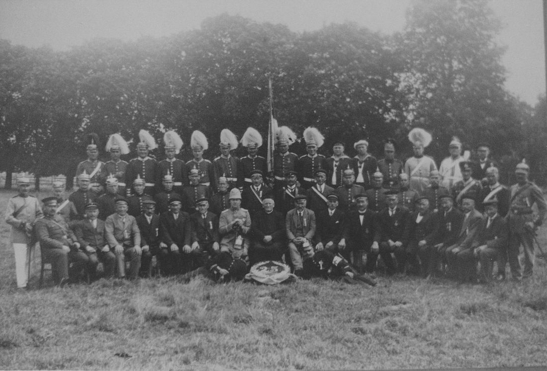 1904In Bühne gründeten 1904/06 die Kameraden Fritz Reddemann, Förster Huwe, Josef Grone, Karl Reddemann, Ignaz Ischen, Ferdinand Götte und Heinrich Menne den "Landwehrverein Bühne", aus dem später die Kyffhäuser-Kameradschaft hervorging. Die erste Fahne wurde 1911 angeschafft. Die Mitglieder der Kyffhäuser-Kameradschaft tragen ihre Friedensuniformen, viele auch die typisch preußische Pickelhaube. Die um 1842 in Preußen eingeführte Kopfbedeckung wurde aus Metall oder - als leichtere Variante - gepresstem Leder gefertigt und war mit einer metallenen Spitze versehen. Anlässlich von Paraden konnte die Metallspitze abgeschraubt und - wie auf dem Foto zu sehen - durch ein helles oder schwarzes Büschel aus Rosshaar oder Büffelhaar ersetzt werden. Im Laufe des Ersten Weltkriegs wurden die Pickelhauben nach und nach durch Stahlhelme ersetzt, da der veraltete Kopfschutz aus Leder sich als völlig unwirksam gegen Granatsplitter erwiesen hatte. Als Teil der Friedensuniform scheinen sie sich jedoch erhalten zu haben.